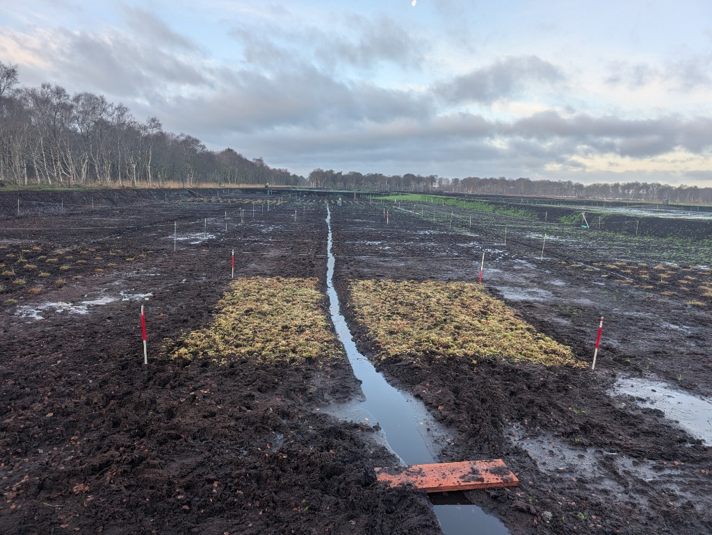 Das Projekt OptiMuM beschäftigt sich mit der Optimierung der Hochmoor-Renaturierung durch das gezielte ausbringen von Torfmoosen. Dafür wurde im Herbst 2025 aus einer ehemals drainierten Grünlandfläche ein rd. 4 ha großer Versuchspolder für die Etablierung von Torfmoosen hergestellt.