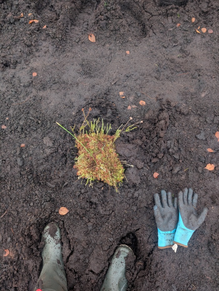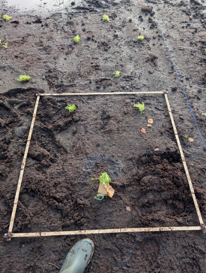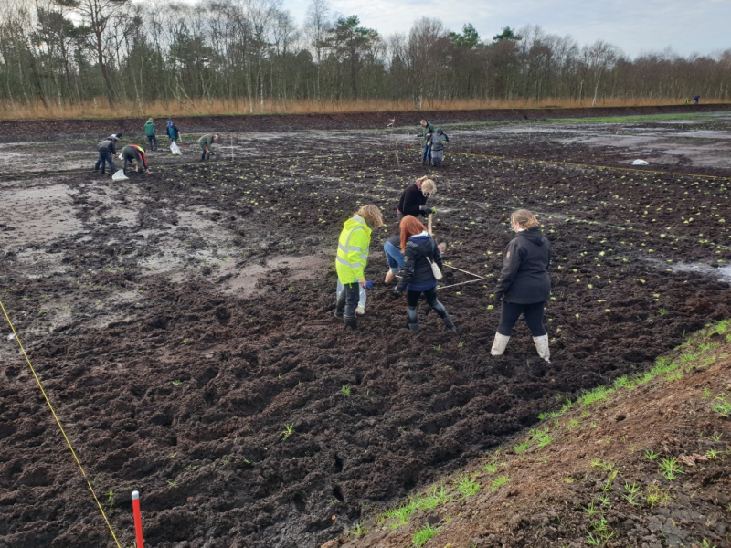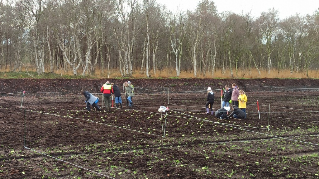 Im November pflanzten wir zusammen mit den Projektpartnern der Universitäten Rostock und Greifswald die Torfmoose - in unterschiedlichen Dichten und mit unterschiedlichen Methoden. Einerseits wurden einzelne Torfmoose in unterschiedlichen Pflanzdichten (1 bis 5 Pflanzen / m²) gepflanzt, andererseits wurden Torfmoossoden gepflanzt. Und außerdem wurden auf einem Teil der Fläche Torfmoosfragmente ausgestreut. Ziel des Projekts ist es nun, zu untersuchen, mit welcher Methode die Etablierung einer naturnahen Torfmoosvegetation am besten gelingt.